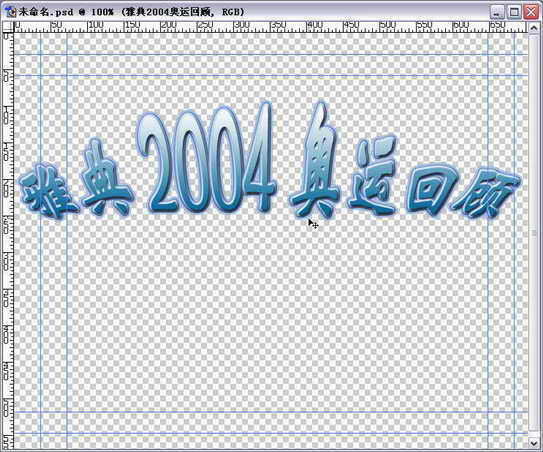 下面我们为作品添加片头文字或其他字幕。片头文字和字幕有两种制作方法,方法一可以利用第三方的软件(如PhotoShop)制作个性化片头标题,方法二则是利用Premiere Pro 1.5自带的字幕编辑器制作字幕效果。这里举例说明如何利用PhotoShop制作个性片头标题。单击Premiere Pro 1.5的“文件→新建→PhotoShop文件” 菜单命令,这时会弹出一个保存psd文件的窗口,这里将文件命名为“片头标题.psd”。系统会自动运行PhotoShop(前提是你必须事先安装过PhotoShop),并新建了一个大小为720×576,背景为透明色。我们利用文字工具在画布的中央偏上位置输入一行片头标题文字,如“雅典2004奥运回顾”。然后对这些文字应用一些漂亮的样式及色彩,最后在PhotoShop中完成的psd文件效果如图8所示。