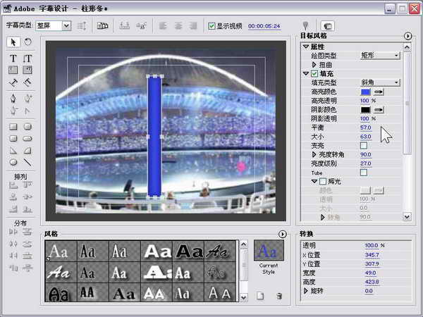 首先单击 “文件→新建→字幕”菜单命令创建一个字幕文件,不过我们这里不是输入文字,而是利用Adobe字幕编辑器中的矩形工具绘制一个矩形长条。在Adobe字幕编辑器中单击矩形工具,然后在屏幕中央位置拖出一个矩形长条,拖动矩形长条的八个方面的控制方块,使矩形长条的大小比例与柱形图中的柱形条类似。为了体现柱形条的立体感,我们可以在目标风格中修改其参数如下:勾选填充选项后,在填充类型选择斜角,高亮颜色为蓝色,高亮透明为100%,阴影颜色为黑色,阴影透明为100%,平衡为57.0,大小为63.0,亮度转角为90.0,亮度级别为27.0。这样就完成了立体柱形条的制作,效果如图10所示。