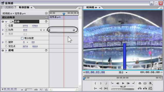 首先在将时间线上的游标定位在时间码为“00:00:00:00”处,即时间线的起始位置。然后单击“柱形条.prtl”的运动特效中“比例”参数前的添加关键帧图标,这样就在时间码为“00:00:00:00”处为“比例”参数添加了一个起始关键帧,设置此处的“比例”参数为1.9,即此时的柱形条是最短的。