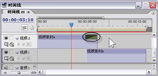 下面具体介绍以下视频转场特效的添加方法。假设这里有视频素材A和视频素材B两个素材,如果视频素材A和视频素材B都未设置出入点,那么这时应该将这两个素材置于不同的视频轨道并使它们之间有一定的重叠。例如将视频素材A拖到时间线的视频2轨道上,而将视频素材B拖动时间线的视频1轨道上,具体位置如图13所示。