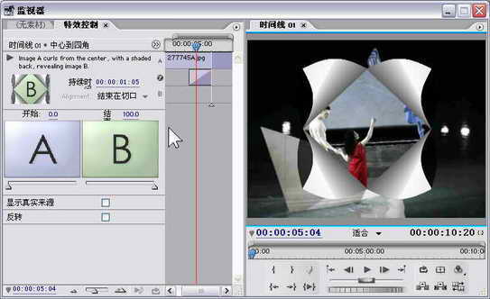 在视频转场的特效控制界面中,我们可以设置视频转场的持续时间以及由视频素材A到视频素材B切换的开始和结束比例等。如果这里将开始和结束比例设置成一样的数字,那么我们可以制作出许多很有特效的效果,如画中画效果。