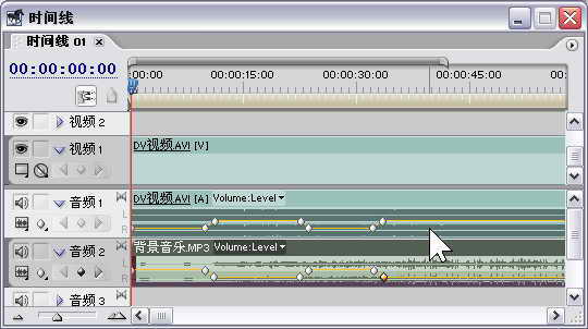 黄色细线位置越高,代表该音频素材的音量电平越大;反之黄色细线位置越低,该音频素材的音频电平越小。当将黄色细线移到音频素材的最下方时,就是静音状态。不过这里的音频素材音量电平在背景噪声处降到最低,而在对白处的音量电平保持不变,这就需要利用关键帧来实现。这里先完成DV片段中音频部分的音量调节。分别将时间线上的游标定位在各个对白开始和结束的位置,然后单击时间线音频1轨道左边的添加关键帧按钮,在这些位置添加关键帧。拖动背景噪声处的关键帧符号使其置于音频素材的最低端,这就实现了背景噪声的位置为静音。下面用同样的方法在这些关键帧符号的位置上为音频2轨道上的背景音乐添加关键帧,对应上面DV片段的音频部分设置,将有对白处的音量关键帧拖到较低的位置。通过上面的设置就完成了当有对白时背景音乐较低,无对白时背景音乐正常的效果。时间线的设置如图15所示。