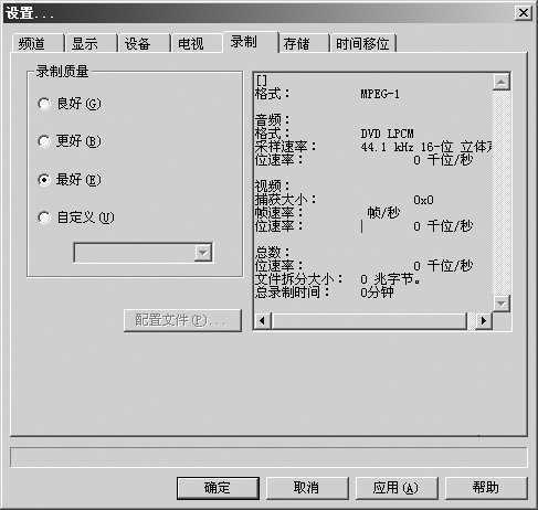点击“录制”选项卡,这里,WinDVR提供了“良好”、“更好”和“最好”三种固定录制模式,其中“最好”是标准的DVD视频格式。我们也可以选择“自定义”选项,根据自己对视频文件清晰度的要求情况进行设置。由于国内有线电视信号自身的质量,建议在此选择SVCD兼容格式(MPEG2)即可(制式为PAL)。如图3所示。