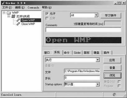 先运行WMP,接着运行Girder,在Girder主界面中点击“编辑→添加组”菜单命令,右键点击新创建的组,选择“重命名”命令,将组名更改为“WMP”。右键点击“WMP”组,选择“命令组”命令,将其重命名为“打开&关闭”,然后在该命令组中再添加两条命令,分别命名为“Open WMP”和“Close WMP”。